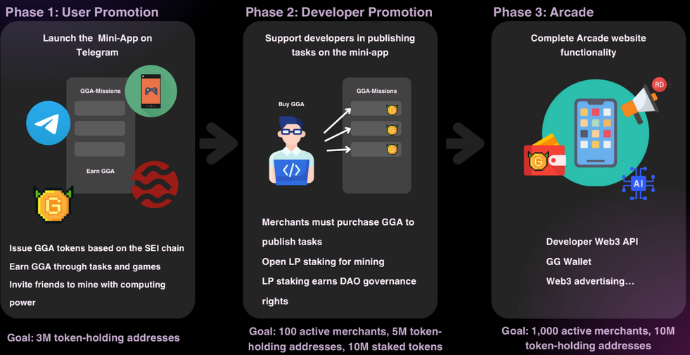 The Good Game Arcade (GGA) project is structured into distinct phases to ensure systematic growth and development. Each phase focuses on specific objectives, enabling us to refine our platform and enhance user experience. As we progress, we will roll out new features, expand our game offerings, and foster community engagement. This phased approach allows for adaptability and responsiveness to feedback, ensuring that the GGA ecosystem evolves in alignment with the needs of players, developers, and advertisers.